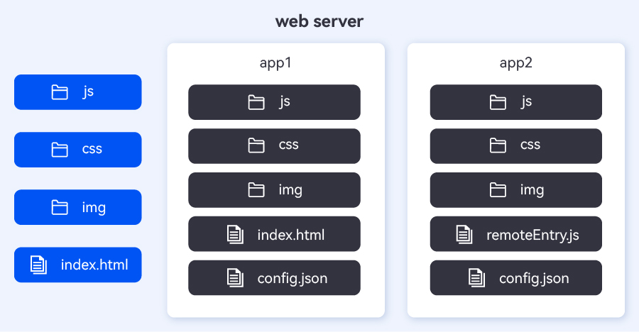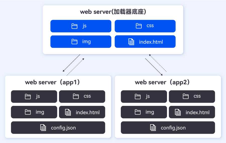 微前端的部署有兩種形式,一種是將所有微應(yīng)用的資源與底座加載器合并成一個文件夾,進行合并部署,只提供一個Web服務(wù);另一種則是將底座和微應(yīng)用分開部署,每個微應(yīng)用都提供單獨的Web服務(wù)。