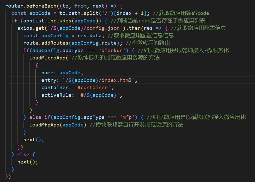 這里需要注意的是,考慮到微應(yīng)用的動態(tài)加載,加載器加載的微應(yīng)用個數(shù)不做限制,如一次性將所有的微應(yīng)用路由全部加載,勢必會造成路由數(shù)據(jù)過于龐大,因此初始化時只注冊中心路由,微應(yīng)用對應(yīng)的頁面路由,則在第一次進入當前微應(yīng)用的時候創(chuàng)建。此步驟放在loader加載器中實現(xiàn)。
