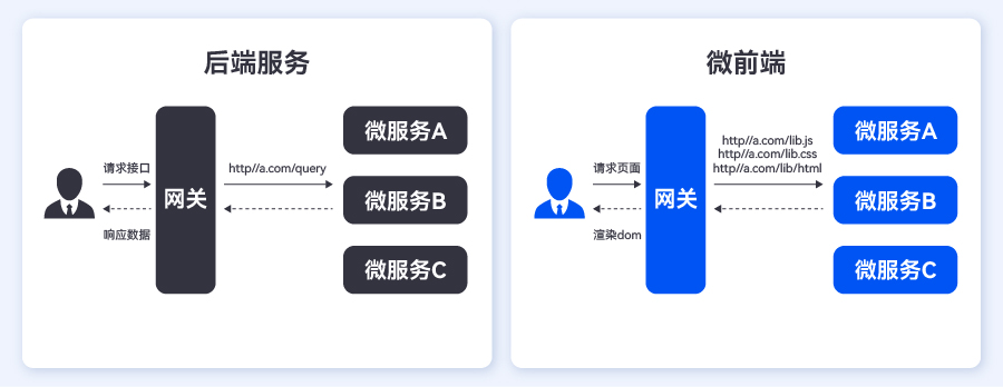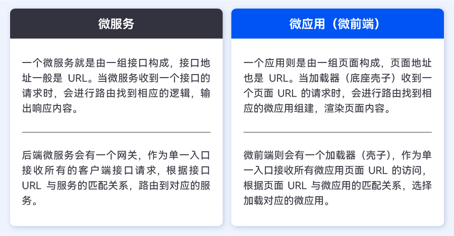 通過跟微服務(wù)進行對比,我們可以更清晰地理解微前端的概念: