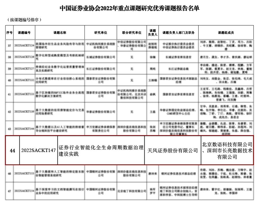 長亮科技與天風證券等公司聯合報送的《證券行業智能化全生命周期數據治理建設實踐課題研究》,成功入選中國證券業協會2022年重點課題研究優秀課題報告名單,也是數據治理領域唯一入選的課題。