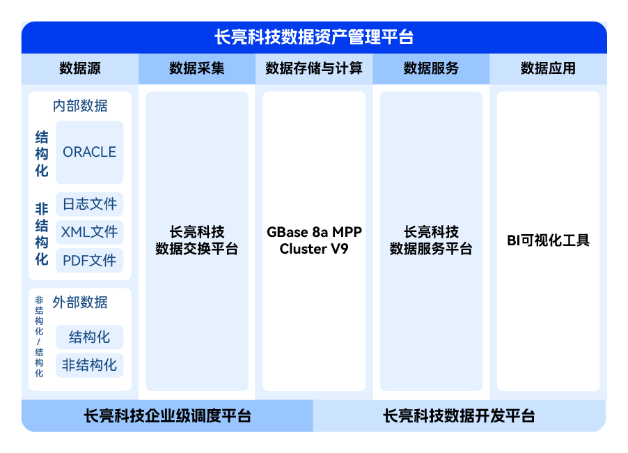 能力共進,推出金融數(shù)據(jù)倉庫聯(lián)合方案 雙方早已在產(chǎn)品適配認證上提前布局,長亮科技數(shù)據(jù)倉庫解決方案與南大通用GBase 8a MPP Cluster V9已完成聯(lián)合測試,雙方產(chǎn)品完全兼容、運行穩(wěn)定,充分滿足金融機構(gòu)數(shù)據(jù)倉庫的建設(shè)需求。 綜合雙方在各自領(lǐng)域的創(chuàng)新優(yōu)勢,該聯(lián)合解決方案以南大通用GBase 8a MPP Cluster V9為核心構(gòu)件,輔以長亮科技數(shù)據(jù)開發(fā)平臺、數(shù)據(jù)交換平臺、企業(yè)級調(diào)度平臺、數(shù)據(jù)資產(chǎn)管理平臺、數(shù)據(jù)服務(wù)平臺,打造海量數(shù)據(jù)計算及復(fù)雜模型分析的技術(shù)平臺,實現(xiàn)跨業(yè)務(wù)領(lǐng)域數(shù)據(jù)的集中采集、存儲和共享,全面、及時、準(zhǔn)確展現(xiàn)關(guān)鍵系統(tǒng)的運行狀況與趨勢,助力金融機構(gòu)全面挖掘數(shù)據(jù)價值。 數(shù)據(jù)倉庫及其上下游系統(tǒng)邏輯關(guān)系圖 系統(tǒng)技術(shù)架構(gòu)圖