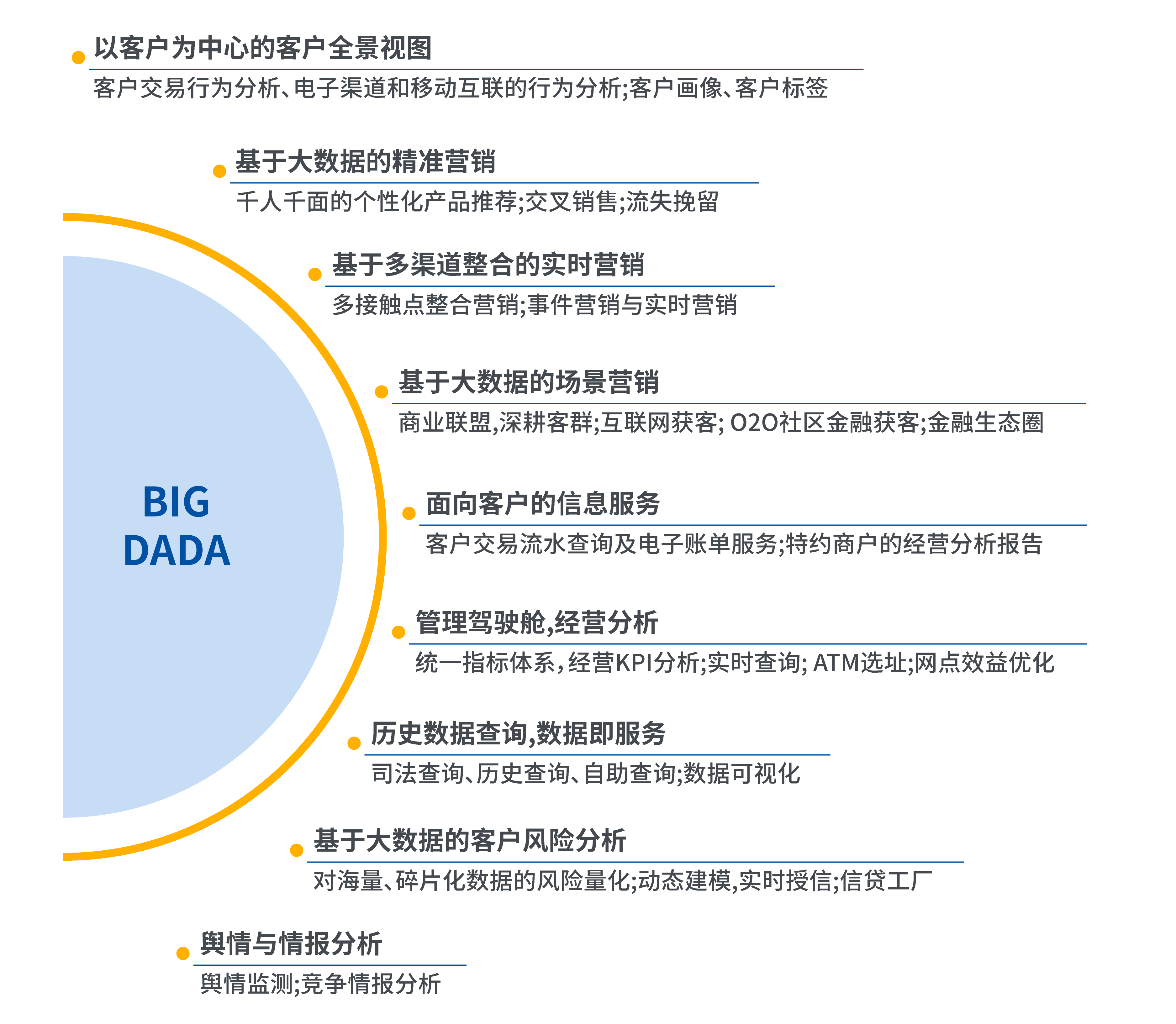 運營管理丨通過大數據分析平臺,強化數據在業務協同中的價值,在市場營銷、產品研發等環節真正實現以數據為驅動,加強總行統籌主導的集約化管理體系,全方面提升運營管理效率。還可以支持網點效益提升、ATM選址優化等。