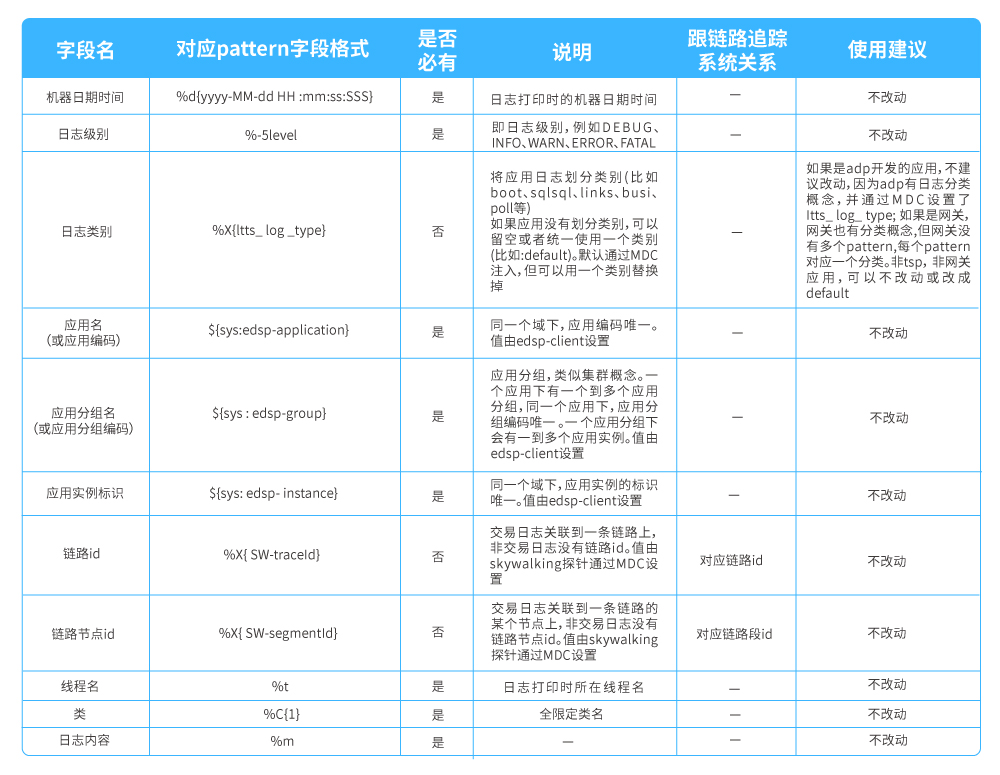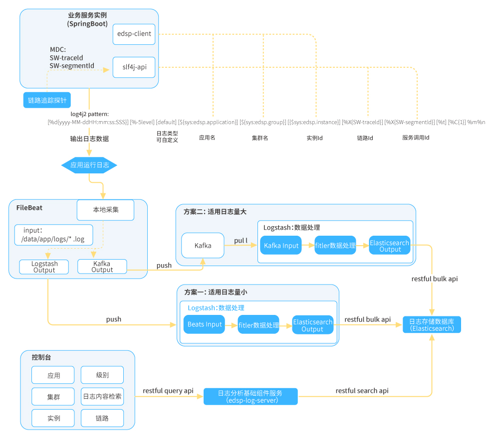 ● 應(yīng)用日志分析:在日志收集和分析領(lǐng)域EFK是普遍采用的技術(shù)方案,但在應(yīng)用日志分析的落地使用上,應(yīng)用日志規(guī)范才是其核心的價(jià)值體系,對(duì)于企業(yè)級(jí)微服務(wù)日志觀測(cè)方面,日志規(guī)范體系需要在日志組件上落地以此作強(qiáng)規(guī)范約束;將規(guī)范中的某些關(guān)鍵數(shù)據(jù)以MDC方式注入,并按標(biāo)準(zhǔn)輸出到日志文件,日志收集組件到指定路徑收集日志數(shù)據(jù)推送至日志分析組件,日志分析組件按規(guī)范解析日志數(shù)據(jù)并進(jìn)行持久化;平臺(tái)通過(guò)日志分析服務(wù)獲取日志數(shù)據(jù)。