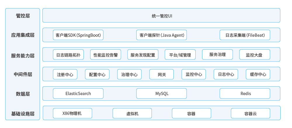 ● 集成層:主要針對(duì)微服務(wù)應(yīng)用提供治理服務(wù)集成能力,主要包括客戶端集成SDK、客戶端性能和鏈路探針、客戶端日志收集代理;