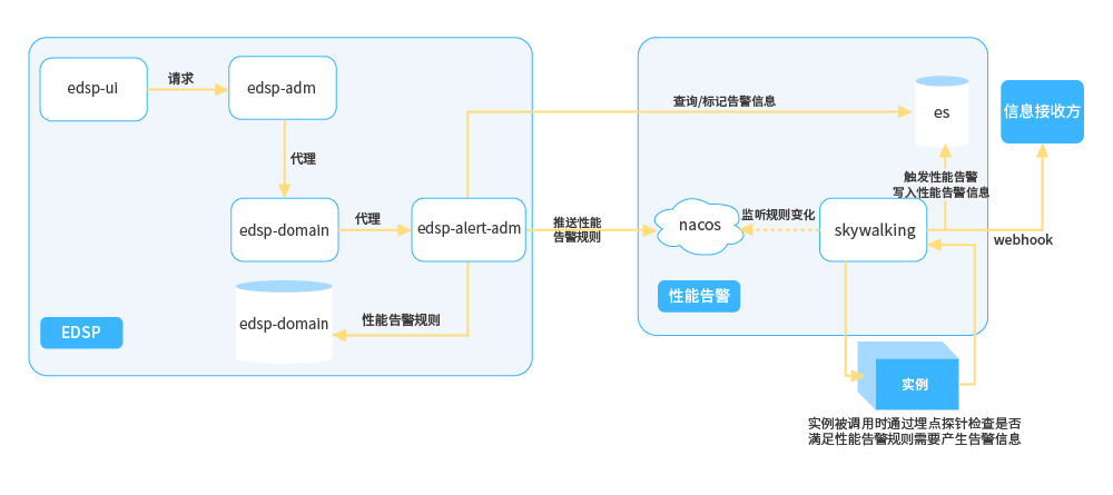 ● 性能告警:通過(guò)管控端配置告警規(guī)則提交到告警管理模塊落庫(kù)持久化,同時(shí)將告警規(guī)則推送至配置中心,性能告警組件依賴配置中心可以動(dòng)態(tài)感知告警規(guī)則的變化并實(shí)時(shí)生效,然后在APM預(yù)處理接收的性能指標(biāo)數(shù)據(jù)時(shí)立刻計(jì)算告警規(guī)則,對(duì)于滿足告警規(guī)則的指標(biāo)數(shù)據(jù)立刻生成相應(yīng)的告警事件,并持久化,隨后產(chǎn)生相關(guān)告警數(shù)據(jù),并將告警數(shù)據(jù)持久化,同時(shí)推送至告警推送系統(tǒng)進(jìn)行下一步推送操作。