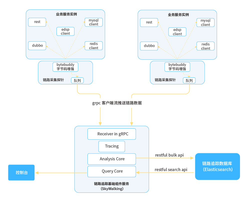 ● 鏈路追蹤:與性能監(jiān)控探針技術(shù)類似,利用Java探針技術(shù),遵循OpenTracing標(biāo)準(zhǔn),收集全鏈路數(shù)據(jù),并分析鏈路數(shù)據(jù)形成調(diào)用拓?fù)洌粦?yīng)用實(shí)例通過(guò)平臺(tái)SDK注冊(cè)到平臺(tái)獲取到APM組件信息,通過(guò)APM組件客戶端對(duì)APM組件進(jìn)行相關(guān)初始化操作,之后依托Agent字節(jié)碼增強(qiáng)技術(shù)在相應(yīng)位置進(jìn)行埋點(diǎn),定時(shí)將鏈路數(shù)據(jù)推送至APM組件進(jìn)行分析并持久化,同時(shí)將MDC信息填充到日志,從而實(shí)現(xiàn)鏈路與日志的聯(lián)動(dòng);平臺(tái)本身通過(guò)訪問(wèn)APM組件暴露的端點(diǎn)獲取相關(guān)鏈路數(shù)據(jù)。