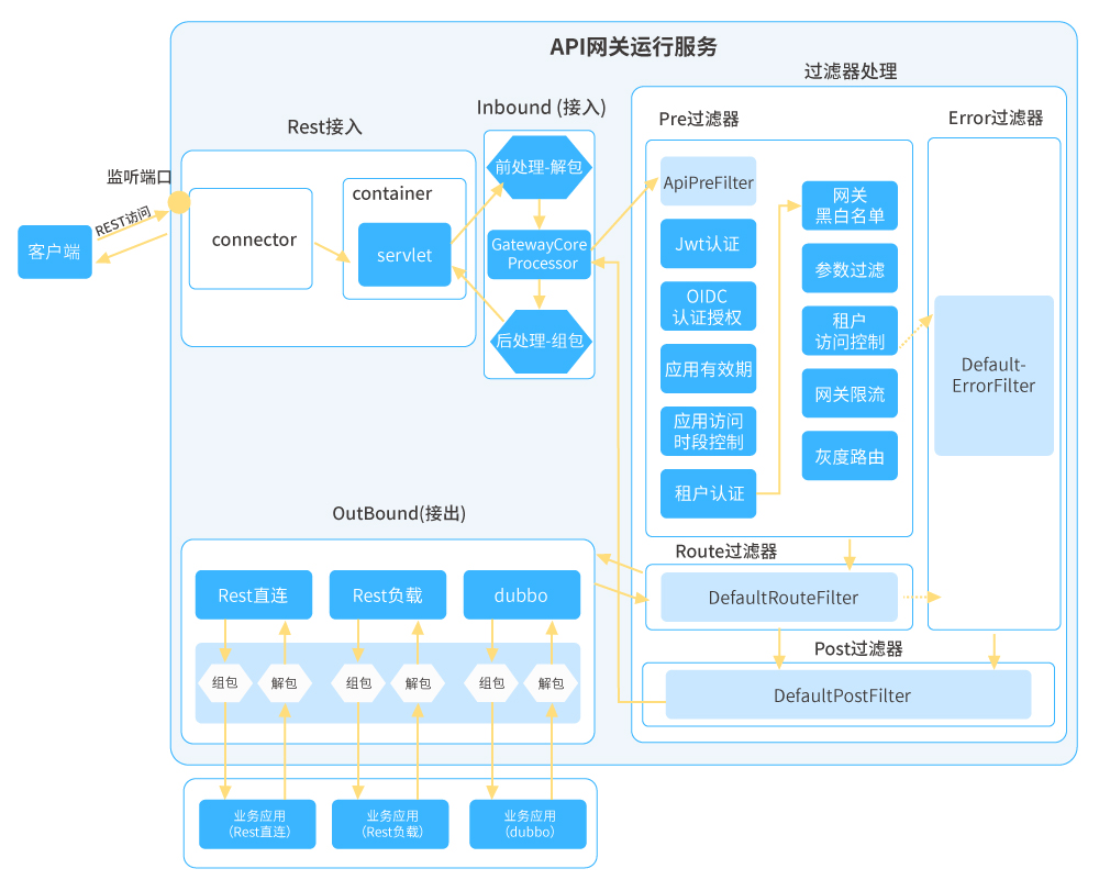 ● 所有過(guò)濾器都正常執(zhí)行則走到路由過(guò)濾器根據(jù)接出協(xié)議將網(wǎng)關(guān)內(nèi)部請(qǐng)求對(duì)象轉(zhuǎn)換成接出請(qǐng)求對(duì)象進(jìn)行外部調(diào)用,調(diào)用成功拿到接出響應(yīng)對(duì)象再轉(zhuǎn)換為網(wǎng)關(guān)內(nèi)部響應(yīng)對(duì)象;