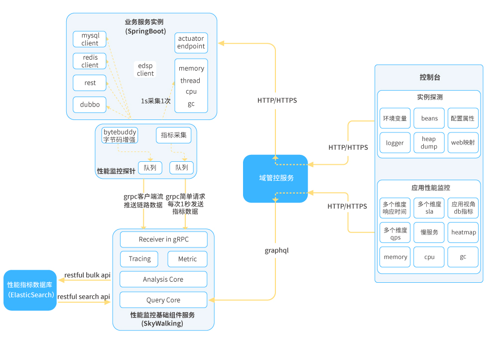 ● 性能監(jiān)控:為了實(shí)現(xiàn)對(duì)業(yè)務(wù)應(yīng)用的零代碼侵入,可采用Java探針技術(shù)實(shí)現(xiàn)對(duì)微服務(wù)應(yīng)用的性能數(shù)據(jù)采集,如Skywalking APM Agent;從應(yīng)用、集群、端口等維度收集性能數(shù)據(jù),性能數(shù)據(jù)包括但不局限于:服務(wù)可用級(jí)別、響應(yīng)時(shí)間、每分鐘調(diào)用數(shù)、百分位響應(yīng)耗時(shí)、CPU、內(nèi)存、GC情況等。應(yīng)用實(shí)例通過(guò)平臺(tái)SDK注冊(cè)到平臺(tái)獲取到APM組件信息,通過(guò)APM組件客戶端對(duì)APM組件進(jìn)行相關(guān)初始化操作,之后依托Agent字節(jié)碼增強(qiáng)技術(shù)在相應(yīng)位置進(jìn)行埋點(diǎn),定時(shí)將性能數(shù)據(jù)推送至APM組件進(jìn)行分析并持久化;平臺(tái)本身通過(guò)訪問(wèn)APM組件暴露的端點(diǎn)獲取相關(guān)性能數(shù)據(jù)。