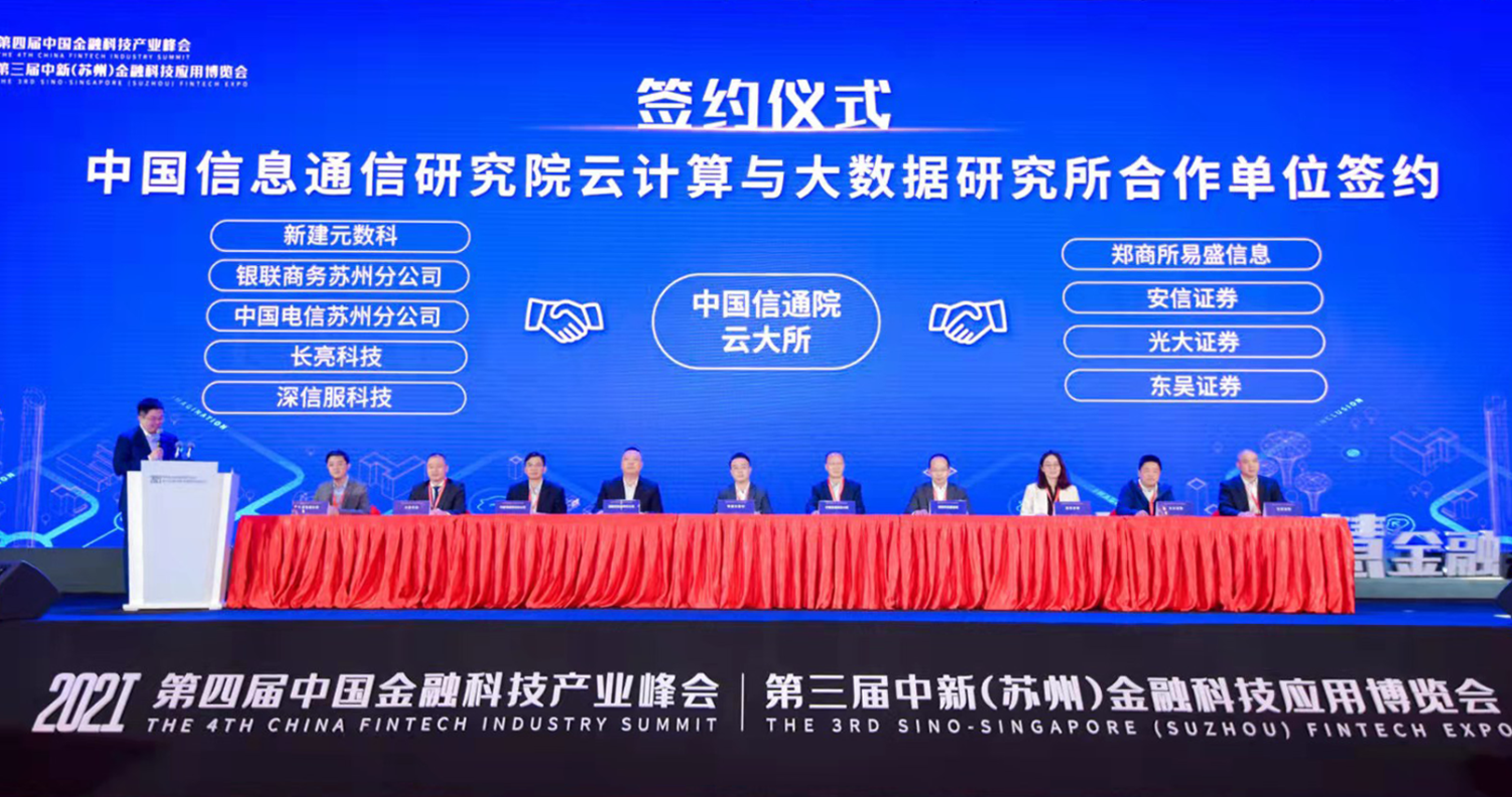 2021年10月28日至30日,第四屆中國金融科技產(chǎn)業(yè)峰會暨第三屆中新(蘇州)金融科技應(yīng)用博覽會在蘇州舉辦。會上,長亮科技成為中國信息通信研究院云計算與大數(shù)據(jù)研究所(簡稱:中國信通院云大所)的合作單位之一,長亮科技總裁助理孫世勝、中國信通院云大所所長何寶宏代表雙方簽署業(yè)務(wù)合作協(xié)議。